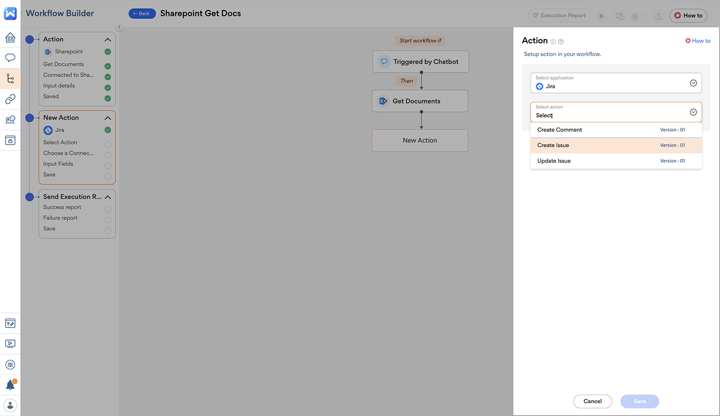 You can set up a SharePoint and Jira automation using Workativ such that, whenever there’s an important product-related update to be shared with the dev team, after the product manager uploads the update document into Sharepoint, it gets shared with the entire dev team via automatic Jira ticket creation by Workativ. Sounds so simple, right?