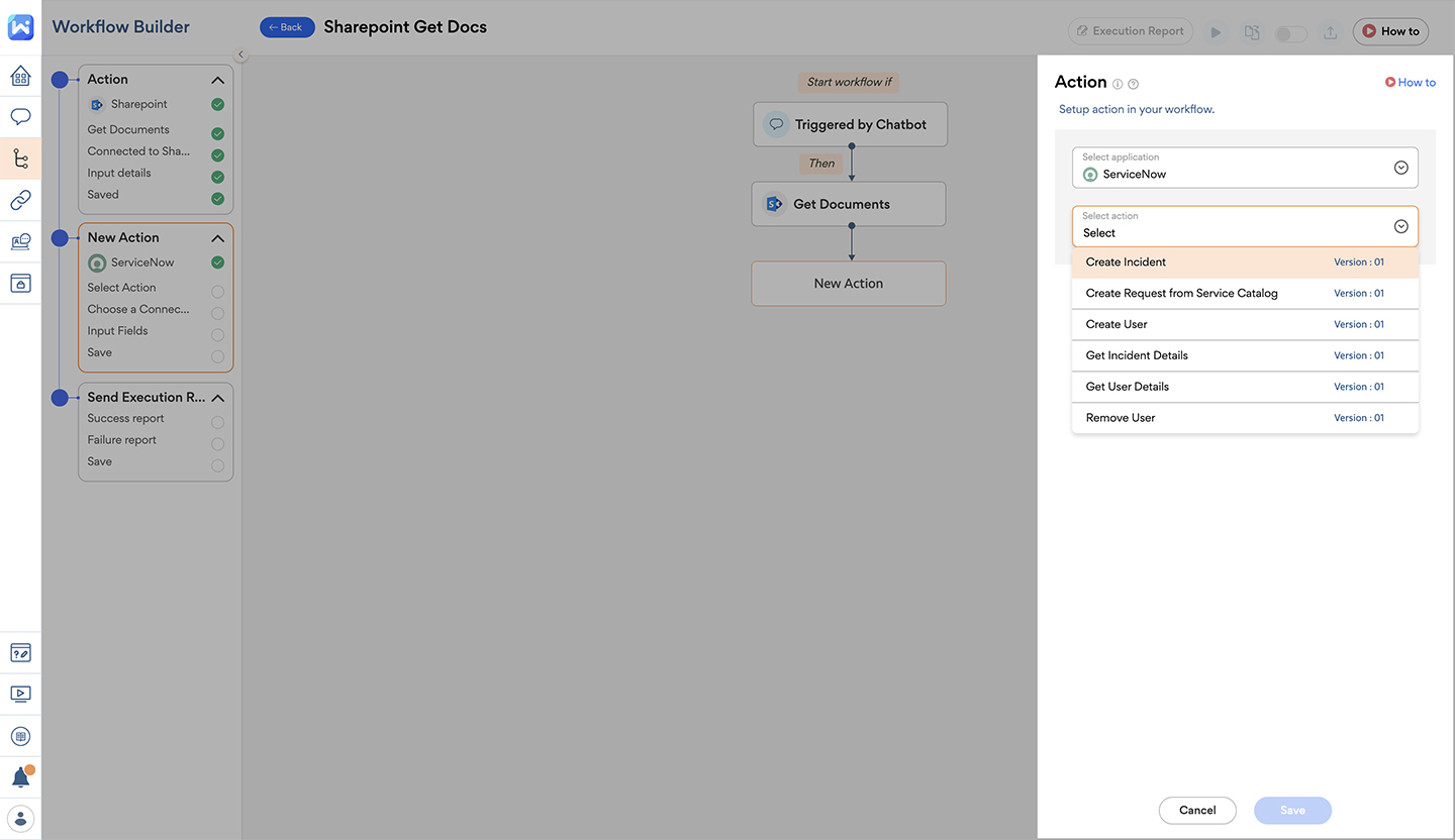With Workativ, you can set up a SharePoint and ServiceNow automation such that, in case the SharePoint automation doesn’t behave as intended, a ticket gets automatically created on ServiceNow giving the help desk team a head-up about the situation so that help desk agents can take over and look into the issue immediately.