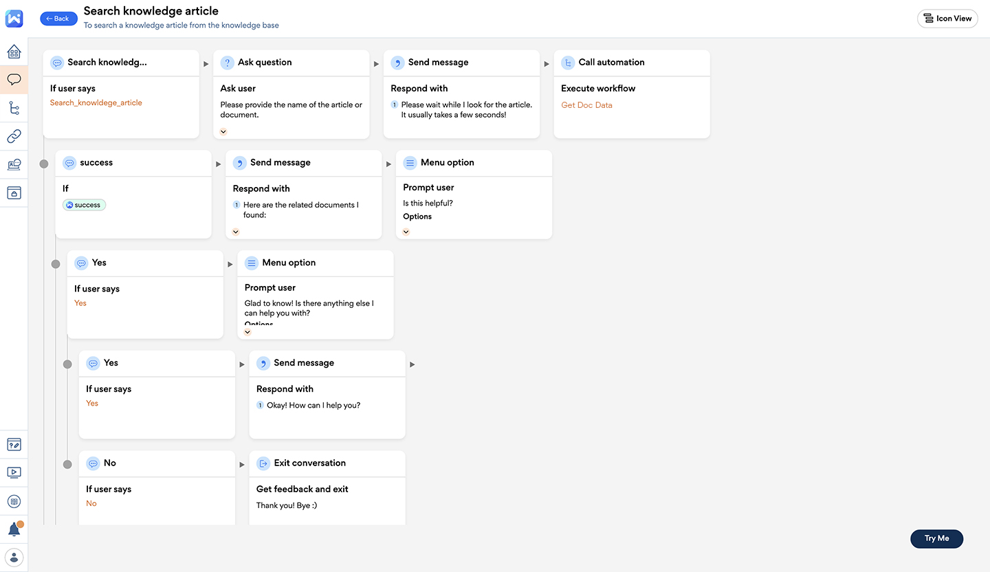 Our easy-to-use no-code chatbot builder helps you build and manage simple to complex conversations, FAQs, integrate app workflows, and personalize your bot in minutes. Deliver autonomous workplace support with purpose built intelligent chatbots.