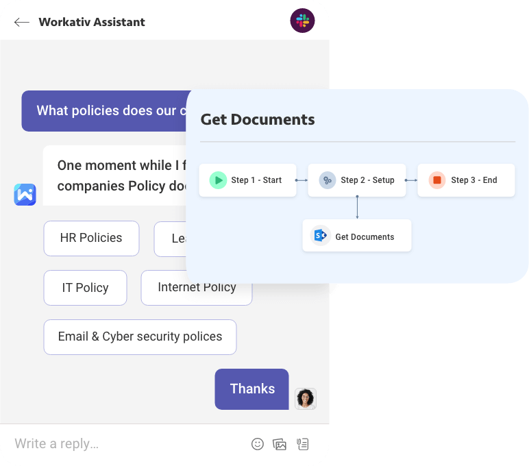 Instead, with Workativ’s SharePoint process automation, employees can ask Workativ to bring up a file link on their Slack or Microsoft Teams app and Workativ will immediately fetch and display the link from SharePoint in the blink of an eye!