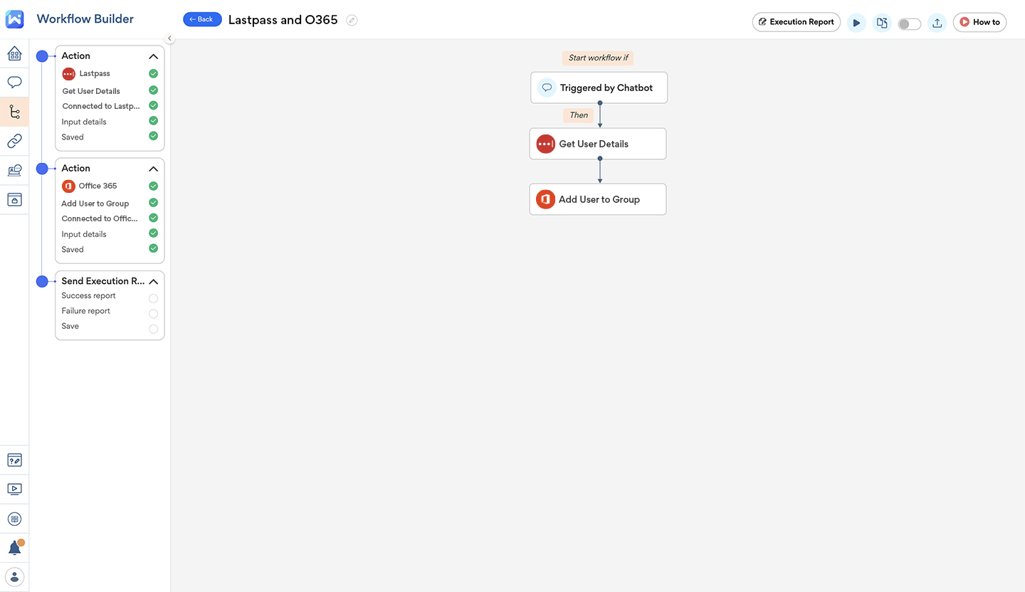 By connecting your LastPass and Office 365 accounts with Workativ Assistant, you can set up a chatbot automation such that, after getting details about a user from LastPass, the details get passed to Office 365 for adding them to the company’s email list. Just like a breeze.