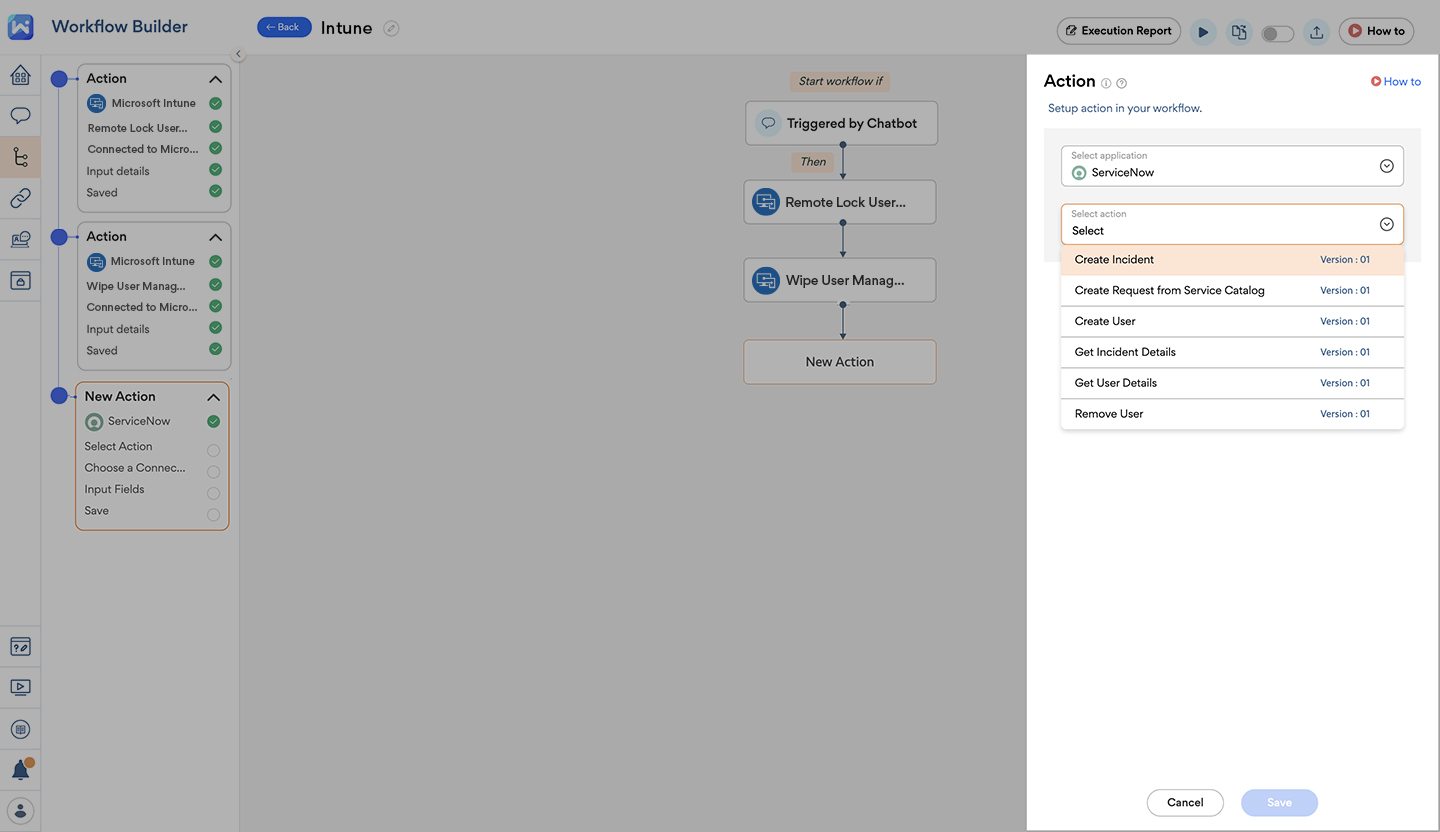 Integrating Intune with ServiceNow and Workativ has huge implications for incident management. This means that when users submit an asset-related incident on Workativ, service managers can address said incident within Workativ. For example, if a user loses their device, a service manager can immediately lock or wipe that device without leaving Workativ.