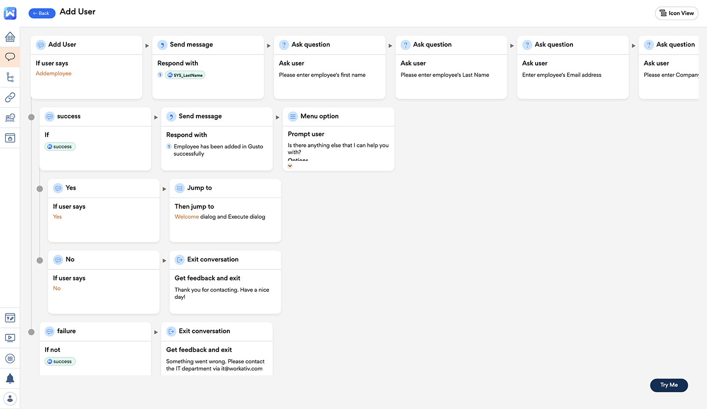 Workativ Assistant is a no-code platform for building contextual chatbots with automated workflows for business apps. You can easily create and add Workativ Assistant’s chatbots to the chat channel of your choice like Slack or Microsoft Teams. Once you add a Workativ Assistant chatbot to your Slack/Microsoft Teams workspace, your employees can make use of the chatbot to self-serve their IT issues, on-the-go, 24×7, on their laptop or mobile device.
