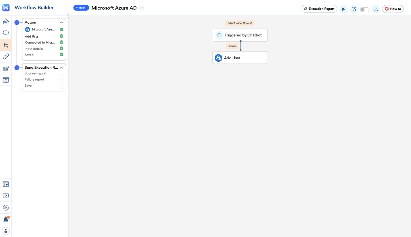 Add user : With Workativ Assistant’s Azure AD chatbot, help desk agents can use the “Add user” automated workflow on the chatbot to create a company email ID for a new employee which gets automatically shared with the employee via text message through the chatbot’s Vonage integration.