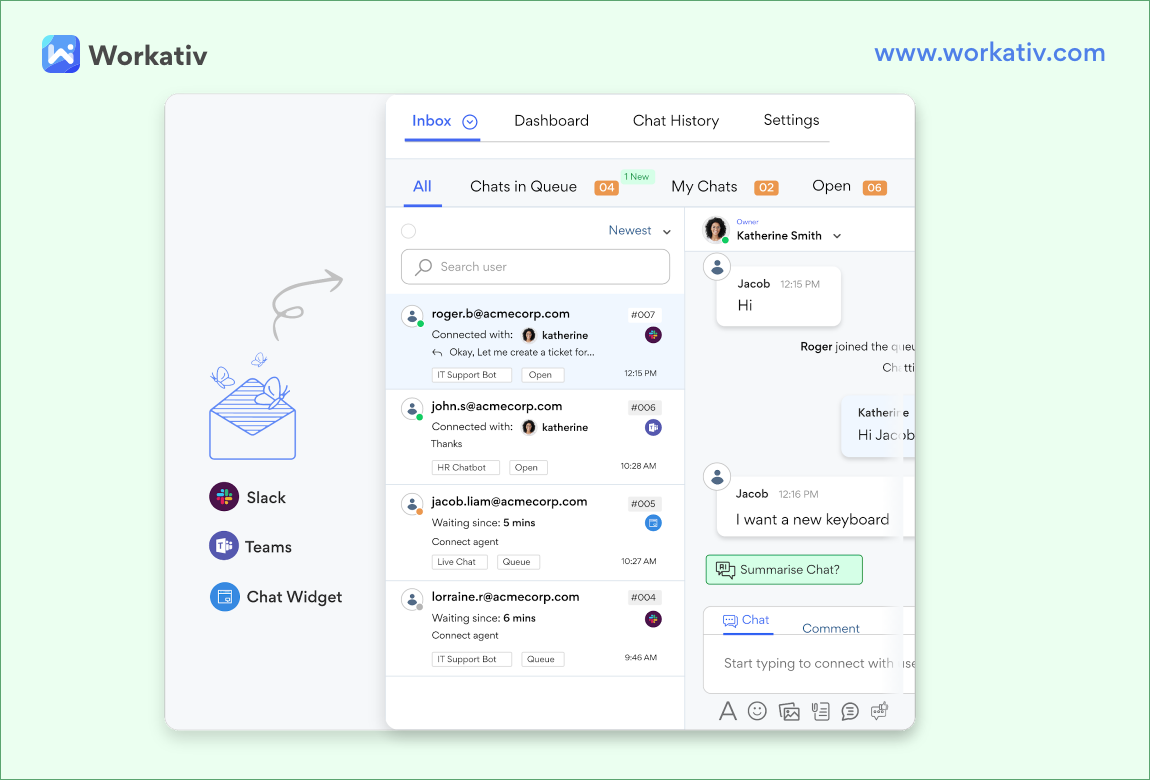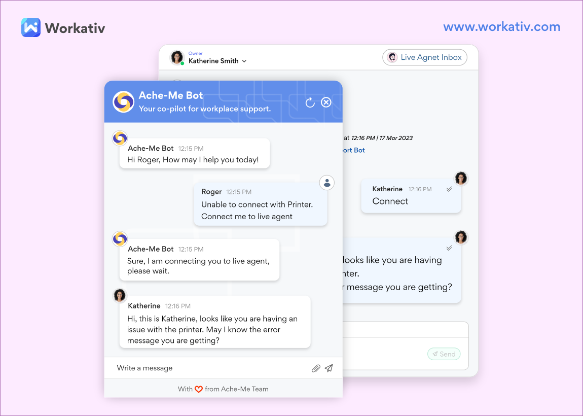 Leverage the shared live inbox inside Workativ’s conversational AI platform for your agents. This will allow them to apply LLM power to decision-making and provide better recommendations to solve critical issues faster. Agents can easily use a unified screen to eliminate confusion, improve comprehension, and use GenAI suggestions to manage more tickets without fatigue.