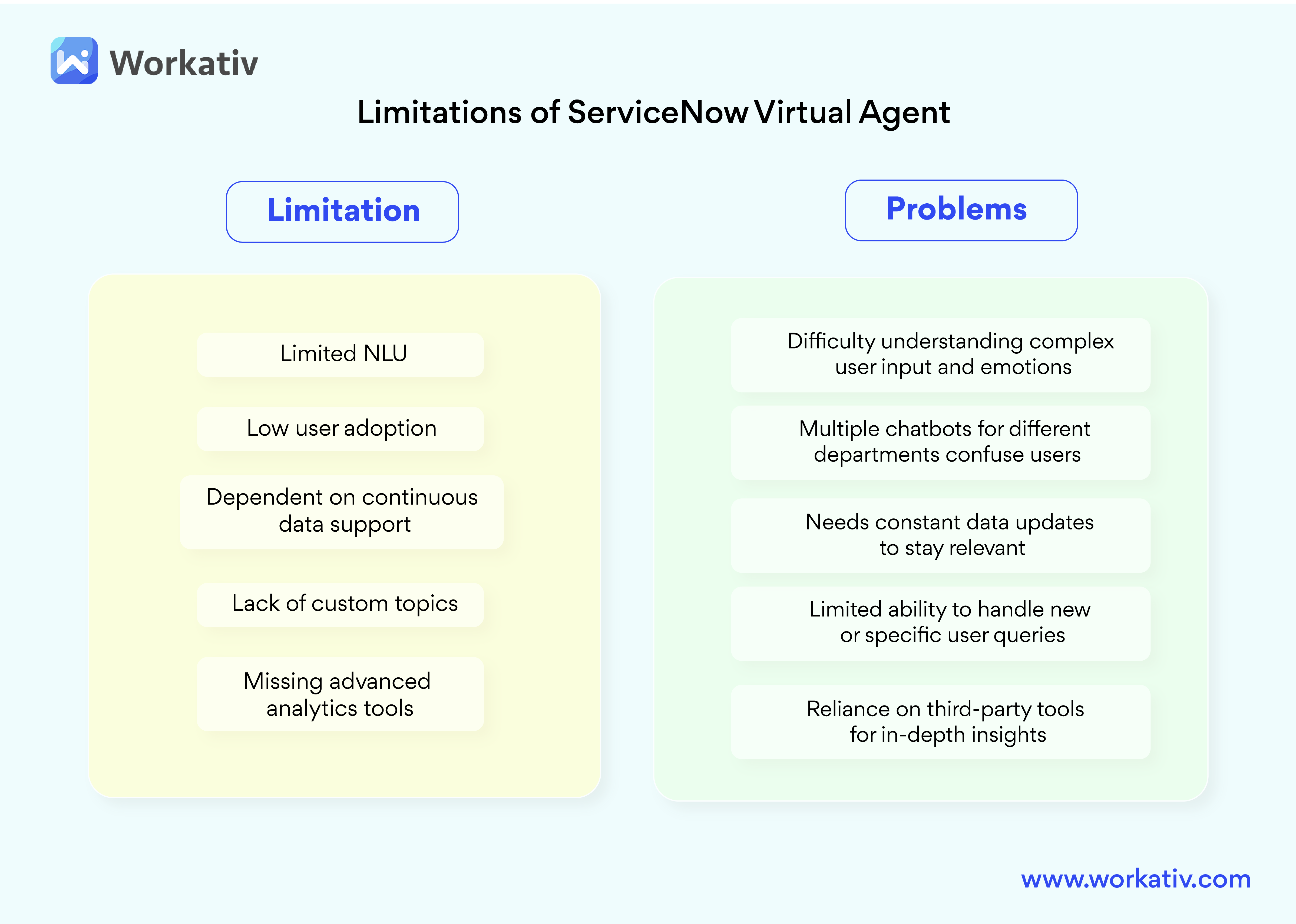 The ServiceNow Virtual Agent has limited pre-built responses to help users address common and unique queries. Also, limited topics need continuous upgrades to catch up with evolving ITSM needs.